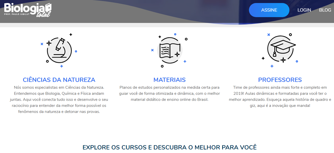 Estou amando estudar pela plataforma Biologia Total. As aulas são muito didáticas e os exercícios contém resoluções bem explicativas. As aulas de biologia são uma delícia! Dá até vontade de cursar Biologia rsrs. Física, Química e Matemática não deixam a desejar. Além disso, a plataforma ainda oferece os minicursos que são incríveis!