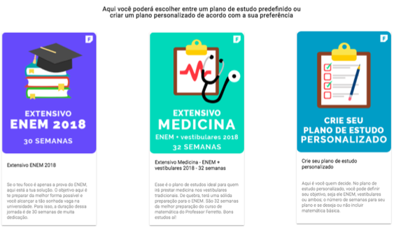 a plataforma é perfeita. só pelas aulas do ferretto o curso já valeria a pena. como estou avaliando em novembro e os professores de linguagens só vão entrar quase em dezembro, vou opinar somente sobre os que já estão lá e eu convivi. matematica- incrivel; a didatica do professor é perfeita, tem muitos exercicios e realmente te faz entender o assunto. os exercícios de manipulação após cada aula são imprescindíveis, muito bom. fisica- o professor é um fofo. às vezes as aulas são bem cansativas pra mim, mas é pq eu n gosto de fisica msm kkkkkkkkkkkkkk. quimica- PERFEITA. o professor michel é um doce, inclusive, pra quem quiser conhecer ele, o canal no yt dele é café com quimica, dá uma olhada!! ele é fofo demais, eu que odeio quimica to evoluindo demaaaaais, muito bom. biologia- incrivel. o professor landim também tem canal, recomendo. tudo que a gente vê na aula cai nos exercícios. ele divide a materia em biologia pra vestibulares, desde o da particular do interior até a maluca da fuvest, e pra enem, bem focado porém não menos incrivelmente boa. ele é absurdamente bom, racho de rir nas aulas dele kkkkkkkkkkkkkkkkkkkkkk não que ele não leve à serio, mas sei la, acho engraçado o jeito dele. geografia- nao vi muitas aulas pq n costumo assistir videoaula pra humanas, mas sim ler livros, mas, pelo pouco aue eu vi, achei super bom. hostoria- pra quem já tá habituado com esse mundo de videoaulas do youtube, deve conhecer o professor do parabólica, se não conhece, recomendo muito!!! é o mesmo professor que dá aula no ferretto, absurdamente bom. só assinei a plataforma pq ja conhecia o ferretto e o pedro e confiava muito no trabalho deles! filosofia- assisti poucas, mas são boas. sociologia- o pedro rennó (professor de historia) é quem dá essas aulas. muito boas. um professor maravilhoso pra uma materia tao chata! esqueci de ressaltar, mas o landim (biologia) faz apostilas absurdamente completas, o que salva MUITO, tanto quem gosta de estudar lendo a apostila de quanto quem ta sem tempo pra ver as aulas, que são bem longas, mas não de um jeito ruim!!! eu, particularmente, prefiro as aulas. muito bem explicadas, engraçadas e interessantes. assisto 3h de aula facil, parece que o tempo nem passa, principalmente com as historias do landim do tanto de doença que ele ja teve kkkkkkkkkkkkkkkkkkkkkkkkk mas as apostilas são muito boas mesmo. os outros professores fazem só o roteiro de aula, entao meio que as imagens e slides que eles vao usar na aula, mas o landim faz a apostila mesmo. o pedro (historia) também faz meio que um resuminho no roteiro de aula. a plataforma tem, ao final de cada conteúdo das materias, um resumo gráfico lindo. RESUMO DA ÓPERA: a melhor plataforma pra quem quer um curso concorrido e não tem condições de pagar 300 reais mensais em um cursinho online que nao presta! o valor compensa demais, inclusive acho muito barato pelo serviço que eles dão, e ainda tem a monitoria, pra tirar as duvidas com calma e a gente é sempre atendido no mesmo dia, ou em até 24h. como vestibulanda de medicina e observando minha evolução em tao pouco tempo, recomendo demais a plataforma!!!!!