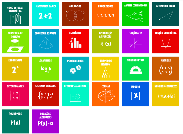 Em matemática, os assuntos tratados vão de matemática básica e assuntos introdutórios, até logaritmos, geometria analítica e números complexos. E em física, desde cinemática, até eletrodinâmica, abrangendo todo o conteúdo do ensino médio.